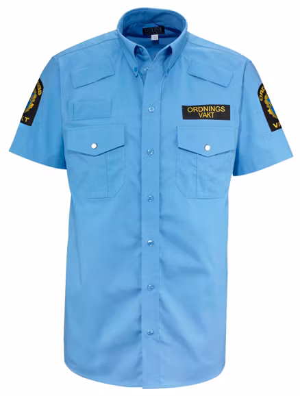 Kortärmad herrskjorta med button down krage, något intagen i rygg. Två bröstfickor med ficklock och guldfärgad knapp, och förstärkning för namnbricka samt hållare för monofon.