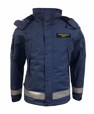 Innerficka, stora sidfickor med mobilficka inuti ena fickan och öppningar för dragning av sladdar. Dragsko i huvan och nedtill på jackan. .