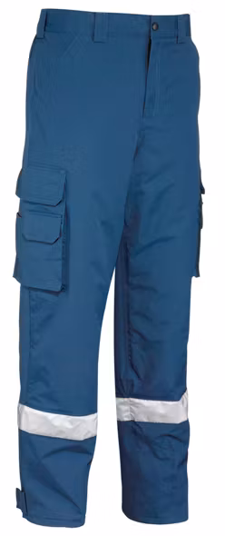 Resår i linning bak, benfickor med ficklock och kardborrefäste. Kardborre i benslut för reglering av vidd. Reflexband nertill på båda benen.