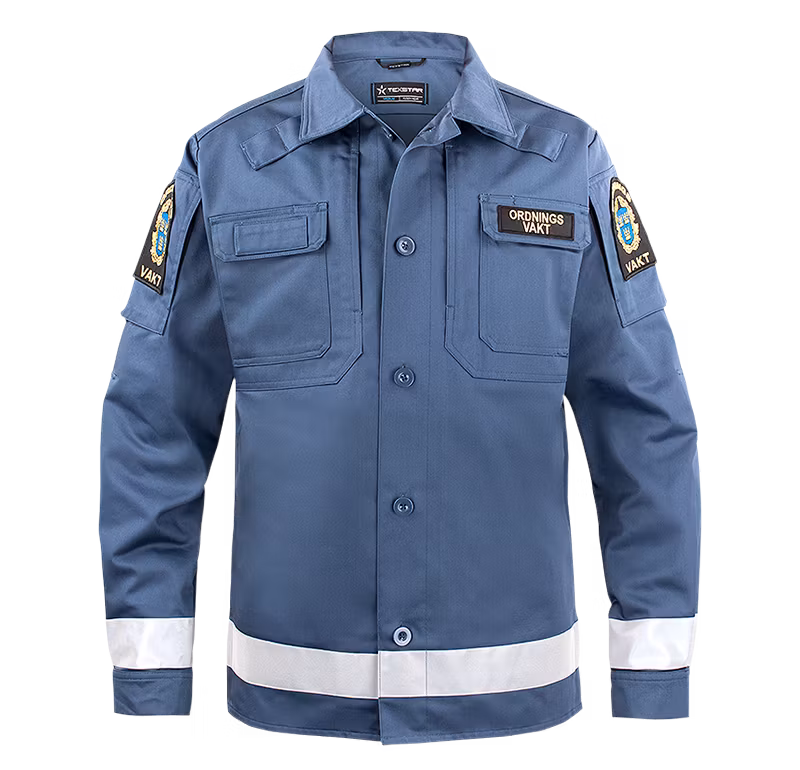 Skjortjacka i slitstarkt material med två stora bröstfickor med dragkedjor integrerat i okets framparti. Monofonhållare, namnhållare på höger bröst, ärmfickor med dragkedja och ordningsvaktsemblem på båda ärmar.