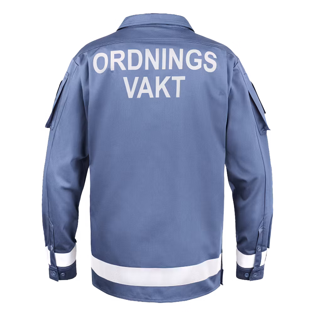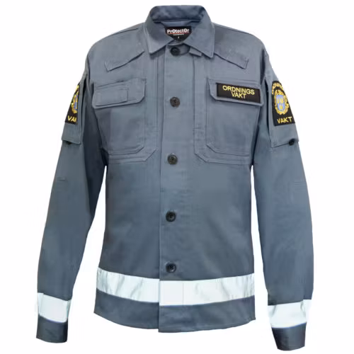 Skjortjacka i slitstarkt material med två stora bröstfickor med dragkedjor integrerat i okets framparti. Monofonhållare, namnhållare på höger bröst, ärmfickor med dragkedja och ordningsvaktsemblem på båda ärmar.